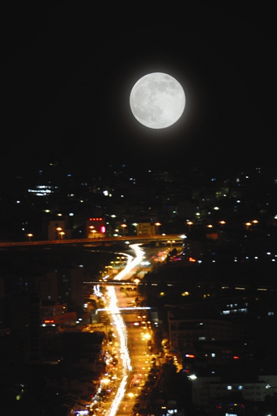 昨晚出现今年全年最圆最大的超级月亮。北京时间19时12分,月球与地球相距为全年最近,只有356991公里;月亮的视直径也最大。19时32分,月亮、地球和太阳排成近似直线,此时月亮最圆。月亮与地球最近和月亮最圆时间仅相差20分钟,难得的机会吸引了大家争相赏月。此图摄于大罗山山顶,山下灯光处为温州大学城。潘祝平摄影报道(采用二次曝光)