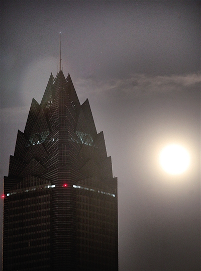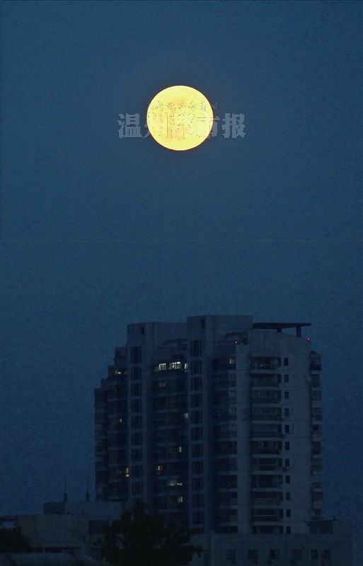 温州网讯昨晚7时50分左右,在温州市区拍摄到的“超级月亮”照亮了温州世贸大厦。昨晚7时11分月球过近地点,距地球35.4万公里,紧接着21分钟后即7时32分又迎来月圆时刻(望),这便是2013年最大最圆的月亮,也就是“超级月亮”。翁卿仑摄