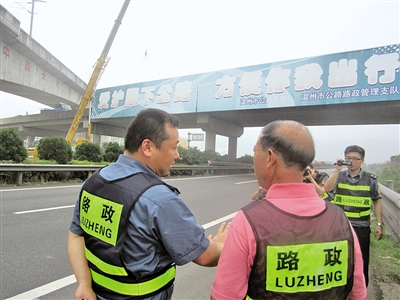 发现:施工人员正在拆除跨线桥上的广告牌。这次拆违后,沿路仅2座跨线桥上留有广告牌。