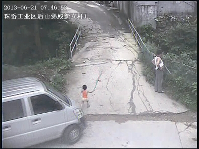 7点46分51秒,一辆运送大米的厢式货车从车路上拐上小桥。见车子迎面而来,小和急忙转身朝爷爷跑去。刚跑出去两步,就被卷到车轮底下。听到有车过来的爷爷下意识转身查看,可当车子从眼前驶过时,他发现孙子正蜷缩着倒在路上,货车右后轮结结实实地从他身上碾了过去。