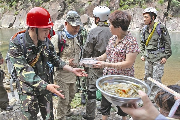 昨天下午,苍南县莒溪大峡谷内,附近村民自发给搜救人员送粥。温都记者蒋超/摄