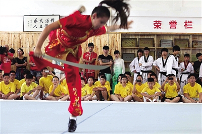 课堂小憩,许多小营员都跑去补水解渴,来自奥地利的叶维亮还在有板有眼练习南拳扎马、出拳等基本功。“看起来挺容易的,但一上手、一出拳,动作就走样,做起来是有点儿难的。不过,跟大家一起学习、出汗,我还是挺喜欢的。”叶维亮说,他要做传播中华武术的使者,将武术的精髓发扬光大。