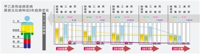 “总体来说,2012年甲乙类传染病发病率呈下降趋势。”市疾控中心主任曾士典表示,去年全市甲乙类传染病发病率为202.13/10万,比2011年下降31.38%,发病率略低于全省平均水平。其中报告发病数居前5位的分别为:肺结核、梅毒、乙肝、淋病和丙肝。记者了解到,根据分类,甲类传染病包括鼠疫、霍乱两种,乙类则包括禽流感、艾滋、乙肝等11个病种。