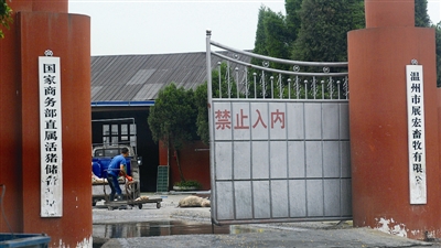 跟到鱼塘后,记者重新返回到此前丢失目标的交叉路口,并在附近找到了一家名为“温州市展宏畜牧有限公司”的养猪场。记者看到,该养猪场的铁门上还标着“防疫重地禁止入内”等字,旁边还挂着一块“国家商务部直属活猪储备基地”的牌子。