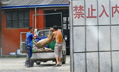 记者一行驱车上前,在大门口看到,养猪场内的空地上有一头大死猪,一个推车上则堆着数头小死猪。小货车司机两手抓着小死猪不停地往小货车上扔,此后更是和养猪场的工作人员一起把那头大的死猪合力丢到了货车内。