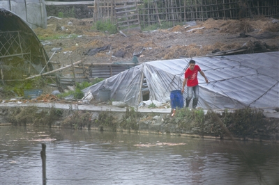 数分钟后,小货车拉着满车的鸡肠等内脏回到养殖场,然后整桶整桶地倒进鱼塘。记者看到,其中一个蓝桶中,还装有数只死鸡。但在当天下午的跟踪中,记者丢失了目标。