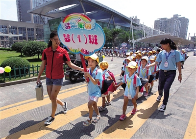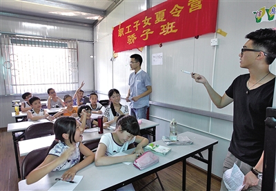 “早上七点刚过,孩子们就陆续被父母送来了,等下午全部接走,大约要六点左右。”学教育学的大学生郑烨烨当起了夏令营的“团长”,与她一起的,还有14名大学生志愿者。“把小孩放在这里很放心,而且紧挨着单位,挺方便的。”一位母亲告诉记者,她家小孩去年暑假也是在这里度过。
