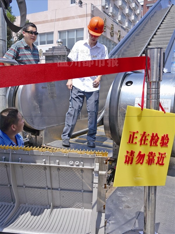 图为市特检中心机电一所的检测人员在对新南站天桥自动扶梯检测。