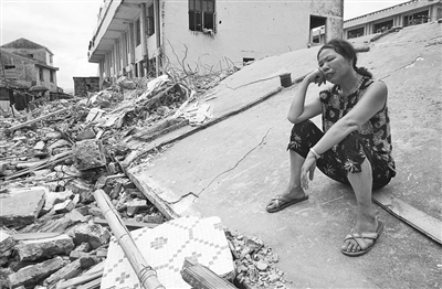 坐在被“桑美”台风摧毁的“家”上,村民欲哭无泪。本报资料照片