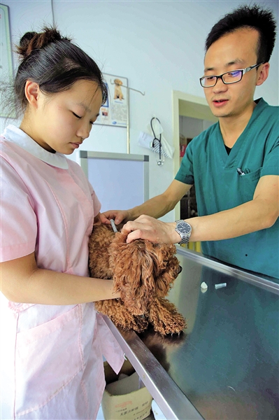 我市一家动物诊所里,一只小狗正接受疫苗注射。刘伟摄