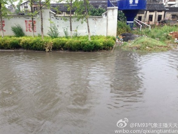 4、【平阳出现积水】@FM93气象主播天天:#天天追风#温州平阳大街上行人稀少,各种小店门帘紧闭。欧南大桥下公路出现积水!