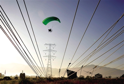 在施工现场,动力伞飞至指定铁塔上方,将绑有沙包的牵引线以空投方式下放,再沿塔飞行,将线放在一座座高塔上,进行“点、线”连接。来自湖北武汉的专业飞行员杜成介绍,这次分两次完成20座铁塔的布线工作,飞行距离达8公里。现场负责人说,长期以来,高山、峡谷地带的输电线路的导线铺设一直是个难题。如采用常规方法,不仅费时费力,而且人工地面铺设钢丝导引绳,然后机械牵引升空,将对苗木产生大面积损坏。而利用动力伞展放导引线,不仅可保护植被,还大大节约费用。李士明蒋文胜摄