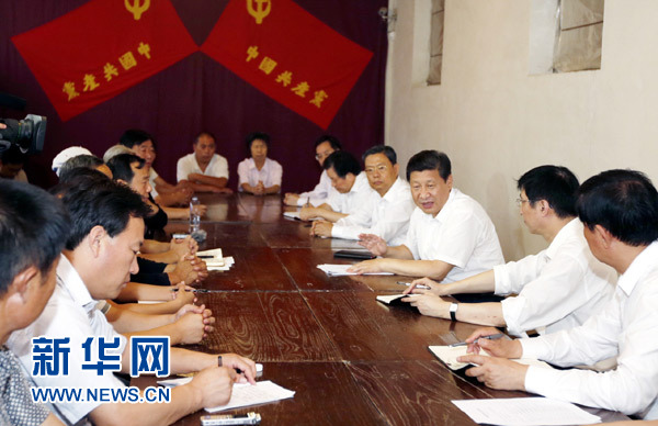 7月11日至12日,中共中央总书记、国家主席、中央军委主席习近平在河北省调研指导党的群众路线教育实践活动。这是习近平在平山县西柏坡革命旧址同当地群众握手交谈。新华社记者李涛摄