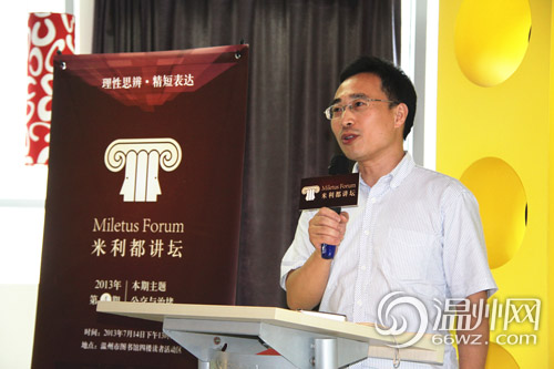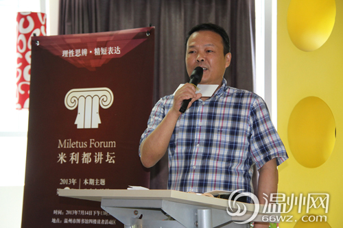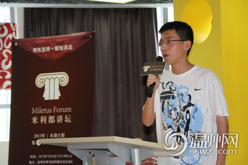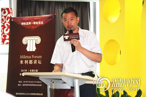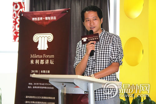 “我今天的主题是‘抓住金改给予、发展公共交通’,我建议给城市的公交站建导向驿站,在这个驿站里面,每个驿站可以按照1-4名的温州的城市志愿者换班看护,城市的市民或者是外来的人员买到城市的IC卡,任何的一个驿站或者是城市的过客都可以轻松的咨询到,另外这又创造了一个就业的工程。”