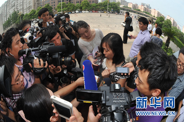7月15日,终审宣判后,唐慧在法庭外接受媒体采访。新华社记者龙弘涛摄