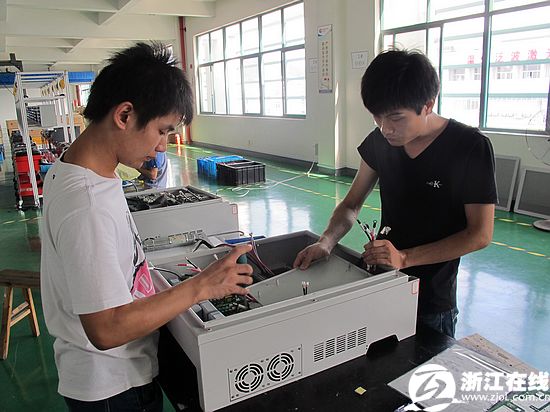 在生产车间,几个工人,正围着一个正方形铁箱子忙和着。据介绍,他们这是在组装一个50千瓦的逆变器。之前,同样功率的逆变器要比现在的大一倍。通过研发,使电路板结构与相关程序得到优化,转化效率提高,才有了现在较为小巧的体积。