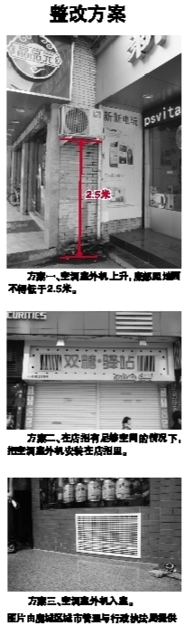 “空调室外机随意安装不仅影响市容,对行人通行也有影响。”该负责人称,他们除了发放整改通知书,还发放了温馨提示,里面有几种整改方案供店主参考,但他们没有按照要求整改。