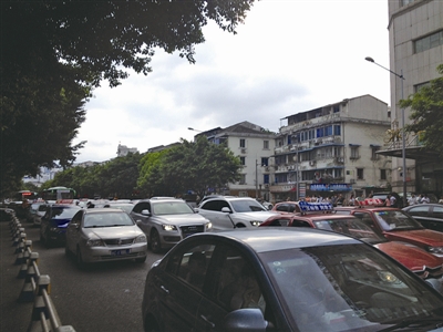 昨天早上7时39分,记者从飞霞南路口出发,沿学院路开往民航路口。从飞霞南路刚一左转进入学院路,就踩了一个刹车。路口进入约50米处右边有一个停车场,一些车辆停在路中等待进入,占据了一个车道,记者只好将方向盘向左打才能通过。在附二医的前面,又不得不连踩了好几个刹车,因为在医院门口,有两辆车因为无法停车在询问医院保安院内是否有停车位,另外有一辆车则打着双跳灯停在路上,也占据了大半个车道。在这一段650米的路上,基本是一踩油门就得接着踩刹车,一路共踩了11个刹车,7时43分才开到民航路口,历时4分钟,平均时速为9.75km/h,为该路段限速50km/h的五分之一。