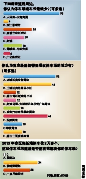 接受问卷的60位市民观点接近一致,除了赞同老城区最难停车外,73%以上的受访市民还指出商业街周边、老城区内的居民小区、医院周边应该大力增设停车位。