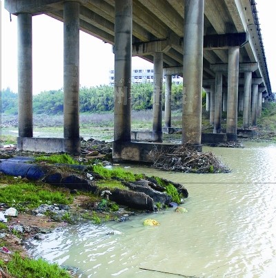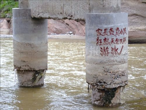 今年7月,《商洛日报》报道称,陕西商州的高桥大桥河床下切桥墩裸露,至少有两组桥墩裸露达6米深,部分桩基础钢筋外露锈蚀(见右图),经专家鉴定为四类危桥。相关部门随即对高桥大桥实施交通管制,并对来往的车辆进行分流,禁止3轴和3轴以上的货车通行。
