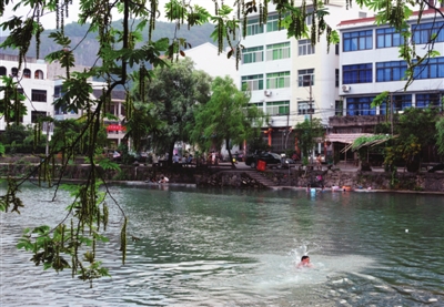 近日,住在白石街道玉溪河畔的小孩子成群结队到河里游泳。郑剑佩摄