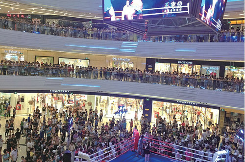 在万达广场内部,上下三层人满为患,扶梯上站得没有空隙,几乎成了移动的人墙。各家餐饮店门口都排着等候的长队。一海鲜楼称位置已满,“有20多个号还在排,估计得1个多小时才能等到。”玩具店、亲子馆是另一个人头攒动的地方,众多的家长带着孩子在这里玩耍。一楼的拳击赛场,成了市民驻足最多的区域。一场专业的泰拳比赛在此上演,引得上下三层的市民围观,在选手的躲闪出拳间,伴随着一阵阵呐喊声,气氛热烈。