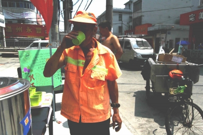 此次爱心活动由区城管与执法局发起,海滨街道沙北村想家便利店是最早响应的商家之一。为了能让环卫工人及时消渴解暑,店主王女士每天都会去附近的免费伏茶供应点提上满满一桶凉茶,随时供环卫工人们饮用。区城管与执法局还结合我区丰富的免费伏茶供应点资源,为环卫工人开辟伏茶“绿色通道”。区城市管理与执法局党委委员冯宪尧告诉记者,这次开展的爱心避暑点活动,是我们对环卫工人开展关爱活动的一个载体,得到了我们全部29个社区,还有沿街商铺的大力支持。(露霞 亚特 潘露)