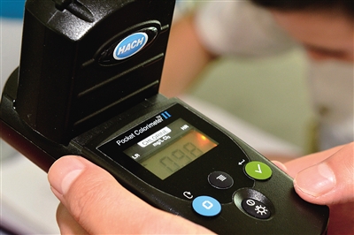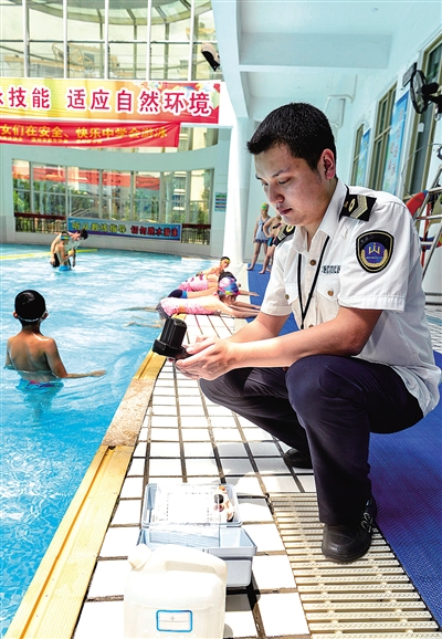 市卫生监督部门工作人员对泳池水质进行余氯检测。杨冰杰摄