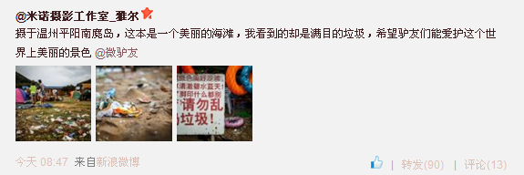网友“米诺摄影工作室_雅尔”关于南麂岛变成垃圾场的微博发出后,引起很多网友的共鸣,大家纷纷谴责随手乱丢垃圾的不文明现象,同时呼吁保护我们这个美丽的海岛,让南麂岛不再哭泣。