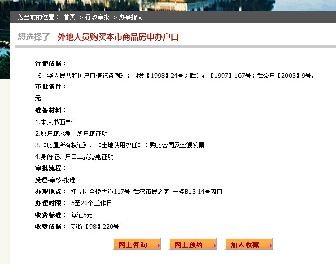 打开武汉市民之家官方网站上的“外地人员购买本市商品房申办户口”这一事项,可以看到详细的办事指南,包括需要准备的材料、办理窗口的地址、办理时限、收费标准等,市民在实名注册后可以在网上进行预约。