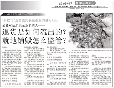 一个多月前,市长专线“12345”联合本报记者,配合公安机关一举摧毁了苍南、平阳、瓯海一带专门收购“乡巴佬”口味袋装卤制品退货、拆除包装“漂白”后,当正规熟食出售的黑色产业链。案发后,一些涉案“乡巴佬”企业回应称:系内部管理不严,导致个别员工(数家企业声称是负责销毁的“锅炉工”)擅自将过期退货卖给不法分子,这是个别员工行为,不是企业行为,且是偶发行为,不是长期的。