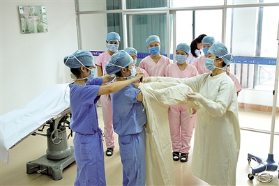 温医大仁济学院的学生在学“穿衣”——手术室无菌技能操作。