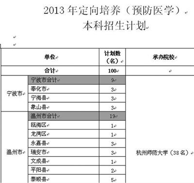 在省卫生厅官方网站6月18日发布的《浙江省卫生厅、浙江省发展和改革委员会、浙江省教育厅等五部门关于开展2013年基层卫生人才定向培养工作的通知》中,也注明了2013年定向培养(预防医学)本科招生计划,其中龙湾区有一个计划人数。