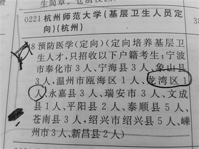 昨日,记者接到投诉核实发现,相关招生通知确有注明:招收预防医学专业(定向培养)一名,“龙湾区”户口。