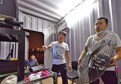 空调都没法降低电影放映室的温度,机器过热罢工,放映员索性搬来大电扇对着吹。杨冰杰摄