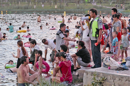 杨府山公园管理办公室相关负责人在接受采访时说,酷暑时节,去杨府山人工湖里游泳的市民越来越多,给他们的管理增加了难度。“去年这里曾发生过溺水事件,事后我们采取多种安全措施,包括每天安排早晚两班救生员,每班配备3名救生人员;在人工湖周围醒目之处设立了警示标志等。但由于公园没有处罚权,对于不文明现象和违规行为,无法监管。”