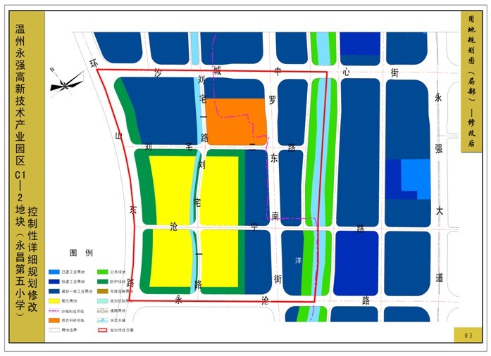 该规划修改范围北至沙城中心街,南至永沧路,东至上横河,西至环山东路,总用地面积约为37.67公顷。根据《温州市教育设施(学校)规划》中明确永昌五小为保留扩建学校,规模为24班,学生为1080人,建设指标达到省九年制义务教育普通学校建设标准的Ⅱ级标准等要求,确定了本次控规修改:将《温州永强高新技术产业园区控制性详细规划》中C1-2的南侧地块的用地性质由一类工业用地调整为教育科研用地,并明确相关控制指标。同时,此次规划修改对该片区内不合理的的道路网进行了优化。另外,由于本次规划修改地块北侧为一类工业用地,因此特别设置宽5米的绿化隔离带,以保对周边环境不会产生太大的影响。