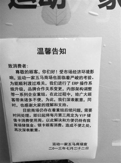 昨日上午,记者来到位于市区五马街122号“运动一家”商场,在通往商场二楼扶梯处,“运动一家储值金卡”巨幅优惠活动广告仍然悬挂在醒目位置。而其广告下方就贴着限时刷卡的“温馨告知”。其内容显示:“目前商场仍存在重组后续问题,即日起将每月第三周定为VIP储值卡消费使用周……”