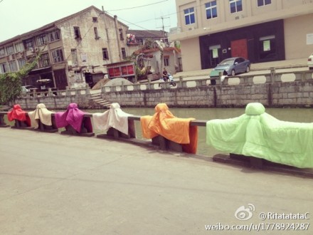日前,她在家休息,打开家门,看见门口河边的栏杆上,整齐地晒着一排五颜六色的被子,顿时被“萌”翻了。“那天天气很好,晒被子的人很多,那一排被子的颜色都是小清新的冰激凌色,” @RitatatataC说,挂在河道边的栏杆上后,还被人用绳子绑住,“这一绑,绑出一颗颗圆圆的凸起,再加上颜色的原因,看起来像极了最近流行的法国甜点马卡龙。”