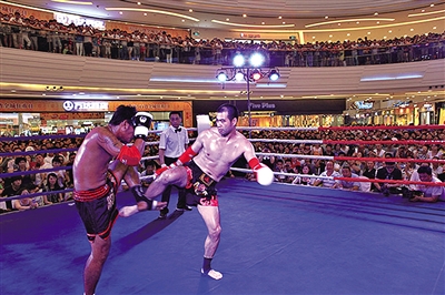“中泰拳王争霸赛”日前在温州龙湾万达广场上演,来自温州的吴正治在比赛中击败了来自泰国的一名拳手,精彩的比赛赢得市民阵阵喝彩。林勇摄
