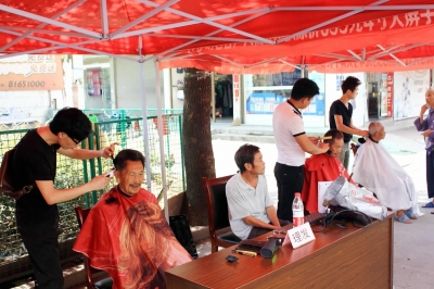 在现场志愿者们冒高温、顶酷暑,为社区群众提供理发、家电维修、电脑修理、健康咨询和中国移动等志愿者义务服务项目。同时,还向社区群众免费发送保鲜盒、风油精、人丹、十滴水等价值6000多元的避暑药品。(黄建勇 摄)