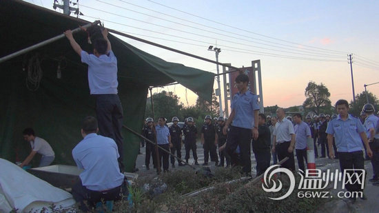 4日凌晨5时许,在多次劝说无果的情况下,苍南县公安局当机立断,组织了特警、交警以及派出所民警等多警种警力,对设置在龙金大道上的灵堂进行强行拆除,果断处置“路闹”,围观群众拍手叫好。