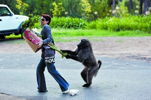 最近一段时间里,在南非开普敦的居民区里,一个抢劫团伙横行无忌:他们在光天化日之下潜入民居,偷食物、偷玩具、扯窗帘、顺被子;甚至公然当街抢夺人们手中的食物,在大摇大摆走进超市拿到香蕉苹果后扬长而去……这样一群盗贼,当地居民却拿他们无可奈何,因为它们是受法律保护的狒狒。