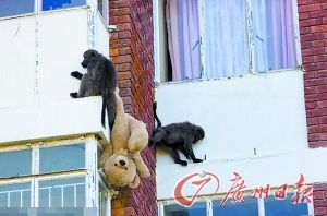 在一幢居民楼陡峭的外墙上,至少6只狒狒发起群攻,寻找偷窃目标,一名居民在向它们徒劳得挥舞着拳头,希望吓退狒狒……不久后,狒狒们带着战利品撤退:两只狒狒从儿童房里找到了一只巨大的泰迪熊毛绒玩具,一只狒狒拿走了一床蓝色小毯子,另外两只狒狒扯掉了一户人家的粉色窗帘。