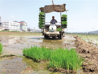昨天中午,篁社村农户张玉军架着插秧机插秧。田里的水正是前一天半夜从附近河道里抽上来的。杨世朋摄