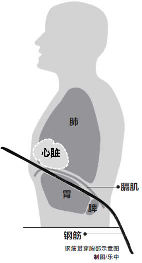 当天下午4时45分,医生开始动手术。他们先是通过胸腔镜探查,明确钢筋在伤者体内的走向,该钢筋是从伤者左后腰部刺入,再穿破膈肌,紧挨脾脏表面,贯穿伤者胃部前后壁,之后又穿过膈肌,刺破心包(心脏的一层外膜,起润滑作用),从伤者前胸穿出。