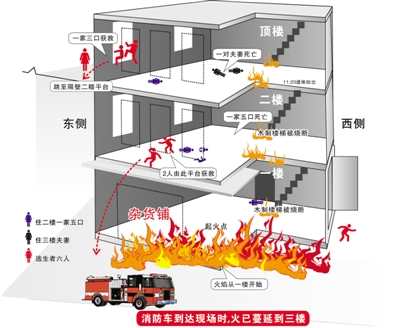 阿培的哥嫂住在这栋楼第三层,已有三年多。火灾时,三楼北向房间的一家三口,从房间窗户爬到了西侧在建的两层楼的楼顶,顺着消防队的救生梯爬下来获救。而住在朝南房间的阿培的哥嫂却没那么幸运。