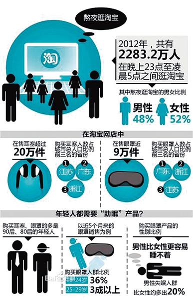 根据统计,去年共有2283.2万人在晚上11时至凌晨5时之间逛淘宝。其中,男性占48%,女性为52%。而我市参与夜淘的人数达30万。