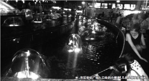 市区世纪广场入口处的小喷泉,几名小朋友在戏水。