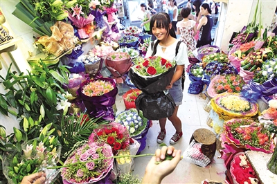 鲜花向来是节日期间的“宠儿”。在市区学院西路的“鲜花一条街”,红玫瑰、粉玫瑰、蓝玫瑰等花束已摆满每家花店。记者昨日在一家名为“金典婚庆花艺”的鲜花店看见,一名工作人员正忙着包装地上的玫瑰花,他说,最近买玫瑰花的市民较多,他不得不抓紧时间赶工。